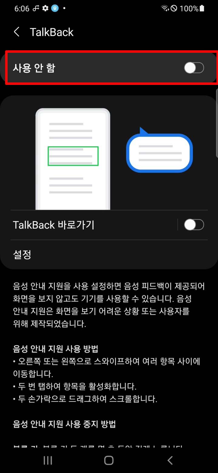 오늘은 갤럭시 음성지원 토크백 끄는 방법에 대해 알려드렸습니다. 사용 안 함을 활성화시키시면 음성지원이 되는 거고 활성화시키지 않으면 음성지원이 되지 않습니다. 정말 가끔 이런 경우가 생겨서 못 끄시는 분들이 많을 것 같은데 벌거 아니니까 이거 보시고 따라 해 주요. 감사합니다.