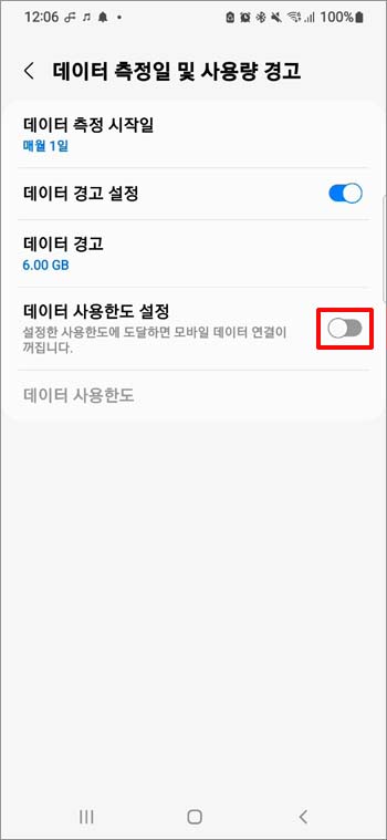 데이터 측정일 및 사용량 경고에 들어가 주세요.