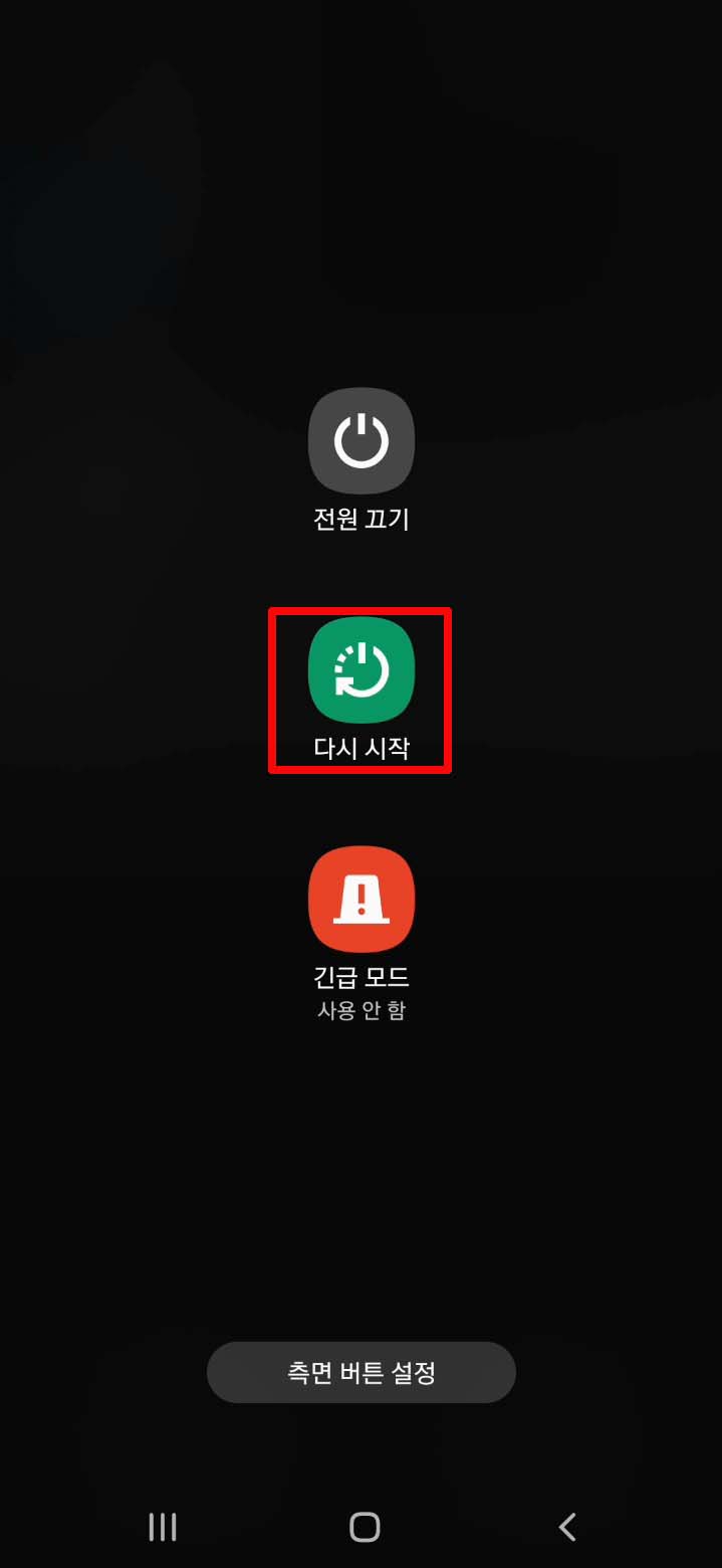 그리고 측면에 전원 버튼을 꾹 누르고 다시 시작을 눌러주세요.